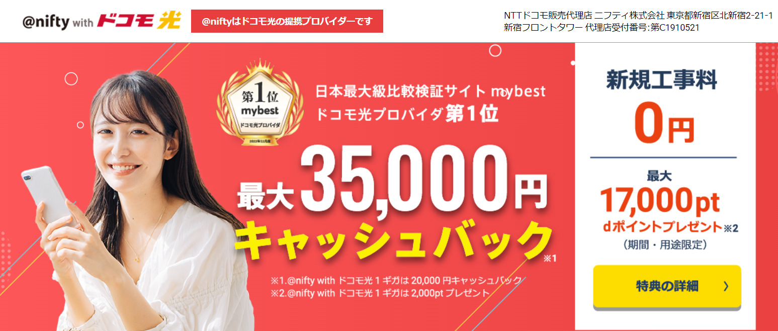 ドコモ光のおすすめ代理店ランキング3位は「@nifty」です。@niftyはプロバイダですが、おすすめ窓口として紹介させていただきました。
