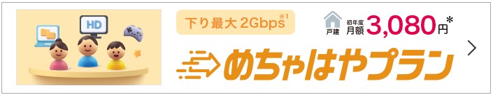 戸建てタイプの場合、最大2Gbpsの「めちゃはやプラン」が3,080円~、最大1Gbpsの「はやとくプラン」は2,970円と、光回線としては破格とも言える料金設定になっています。