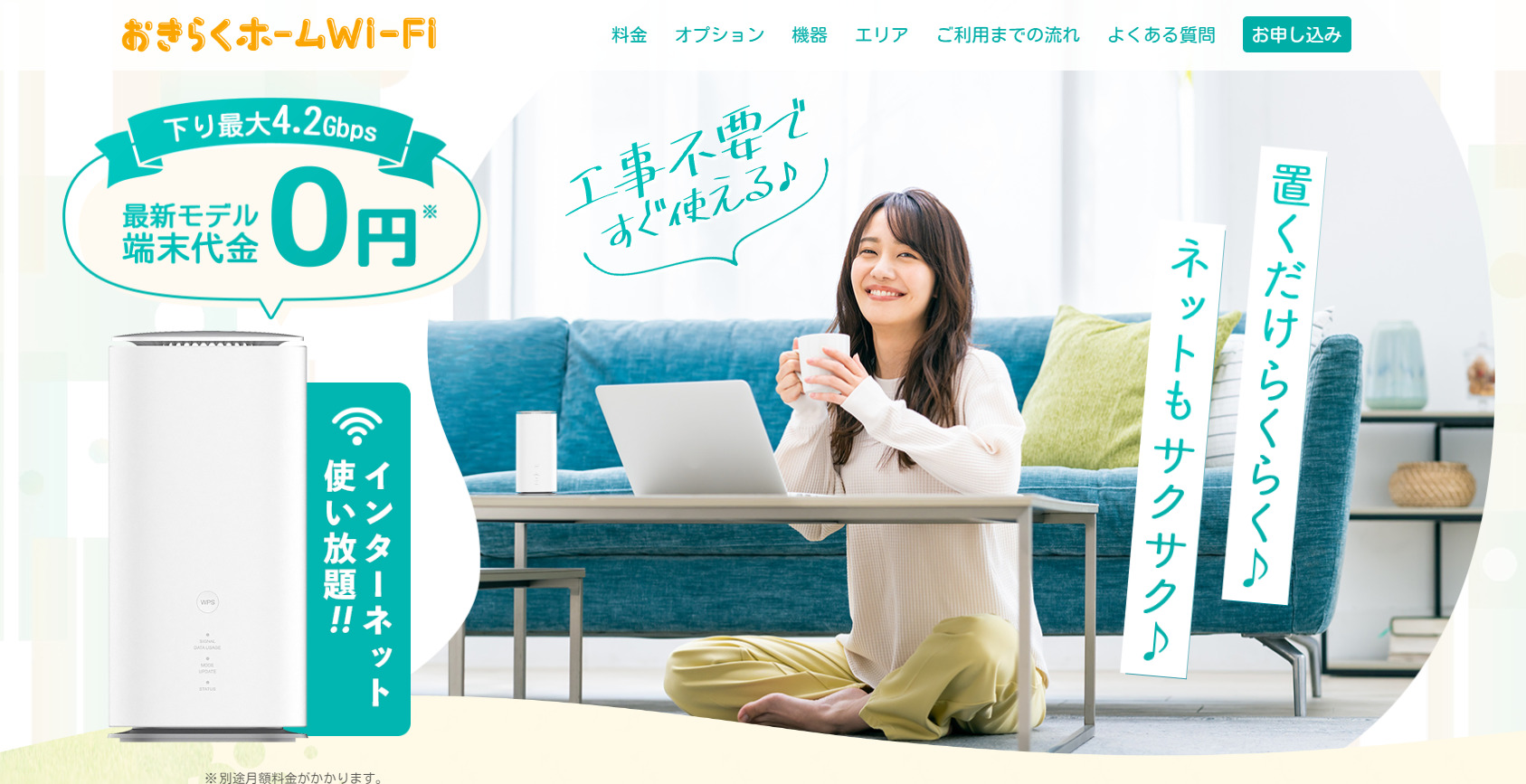 おきらくホームWi-Fiは工事不要で端末が届けばすぐに利用できるホームルーターサービスです。