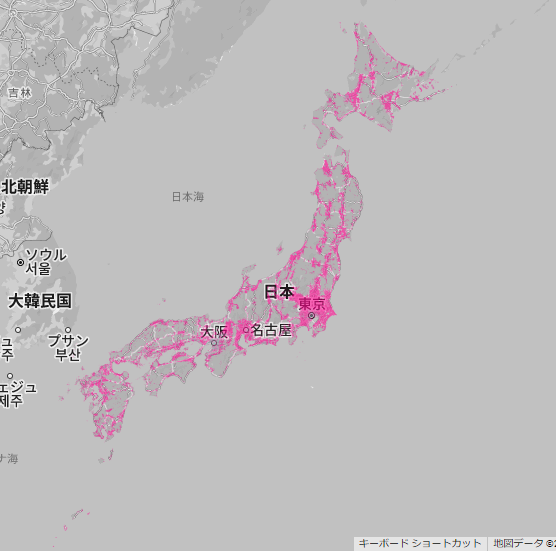 東京・大阪・名古屋といった都市部はピンク色の範囲が広いですが、そのほかのエリアはかなり限定的ですね。